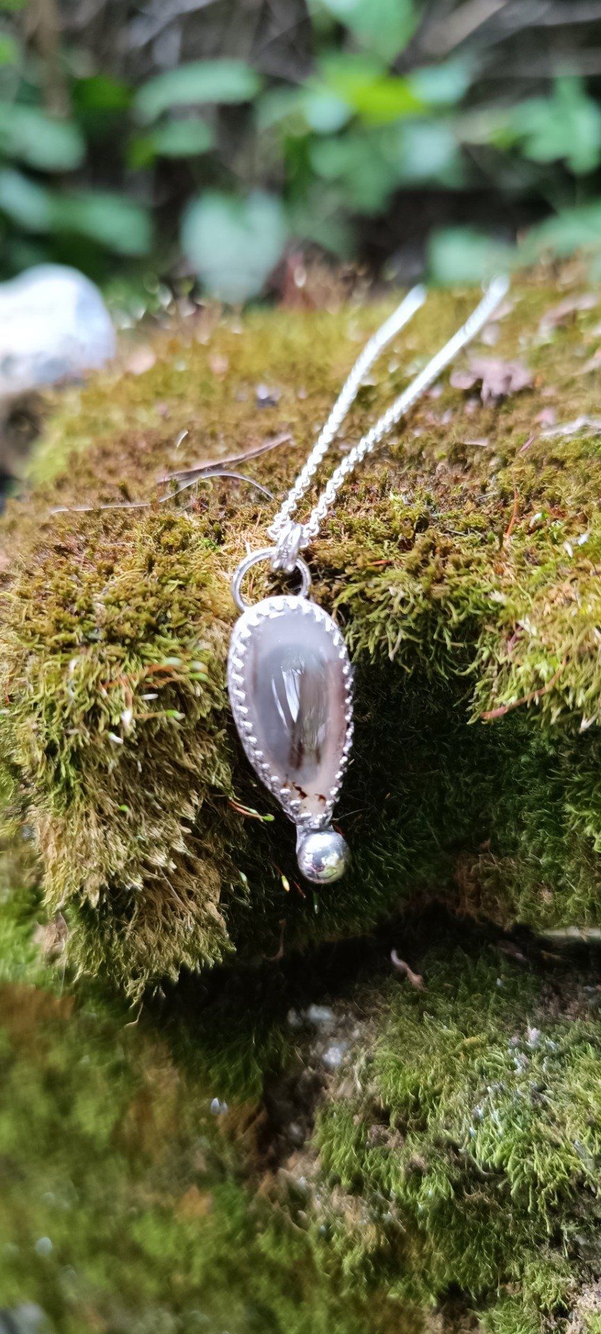 Agate du Montana en forme de goutte, serti couronne, bille d’argent et dos ajouré. Couronne Nomade est un pendentif brut et élégant, comme une amulette née de la terre, à porter librement, en lien avec l’essentiel.