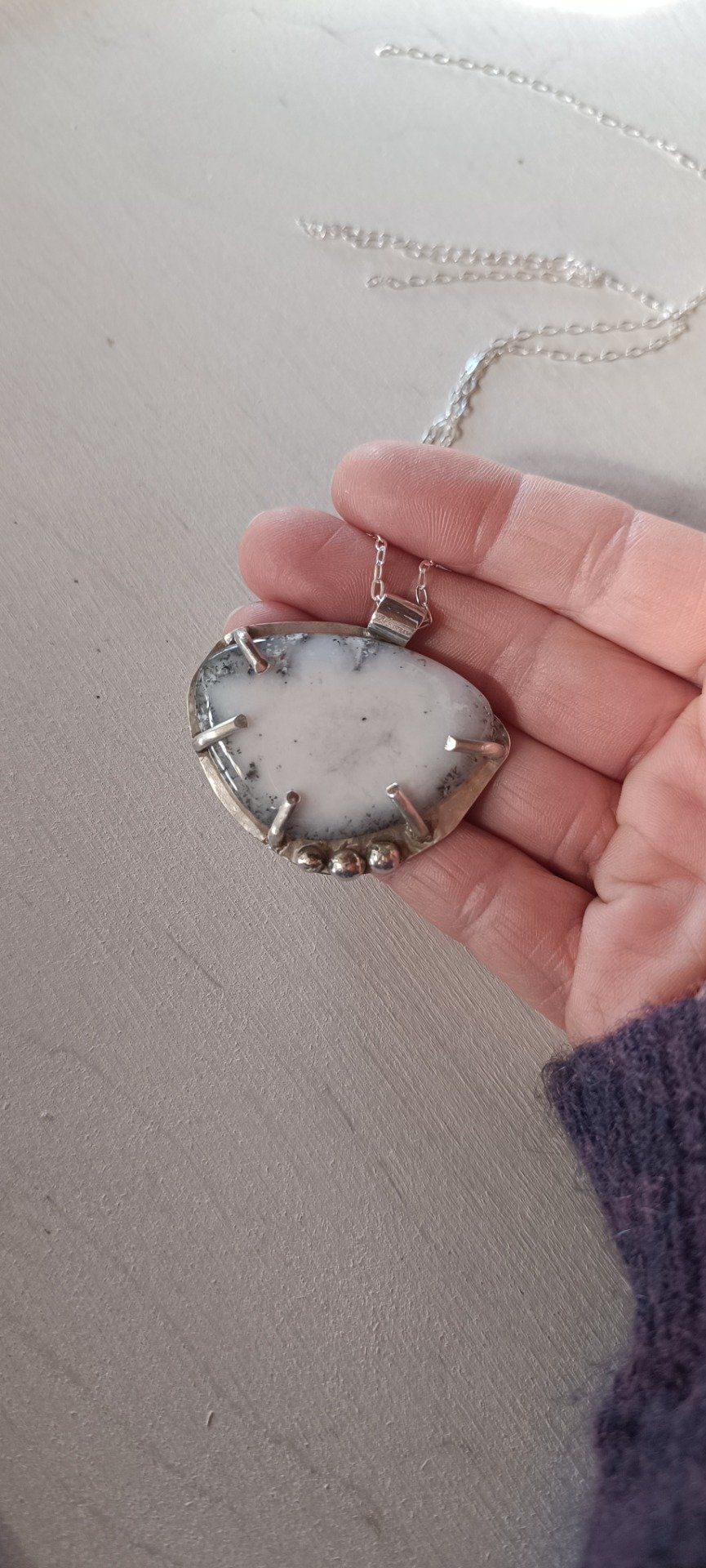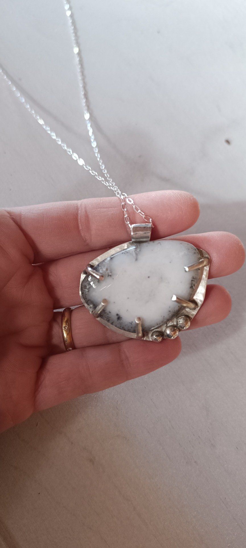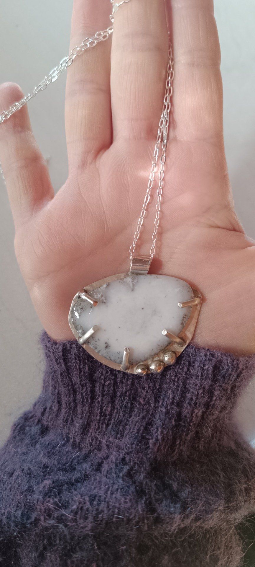 Le blanc domine, laiteux et apaisant, parcouru de quelques veines brumeuses. Trois perles d'argent ponctuent le bas du bijou, comme des étoiles posées là pour veiller.