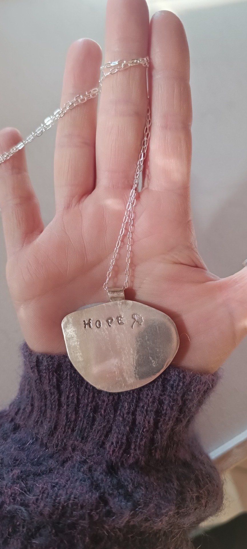 Au revers, un mot gravé : hope. Un murmure intime, pour se rappeler chaque jour que même dans les silences, quelque chose pousse, éclôt, respire.