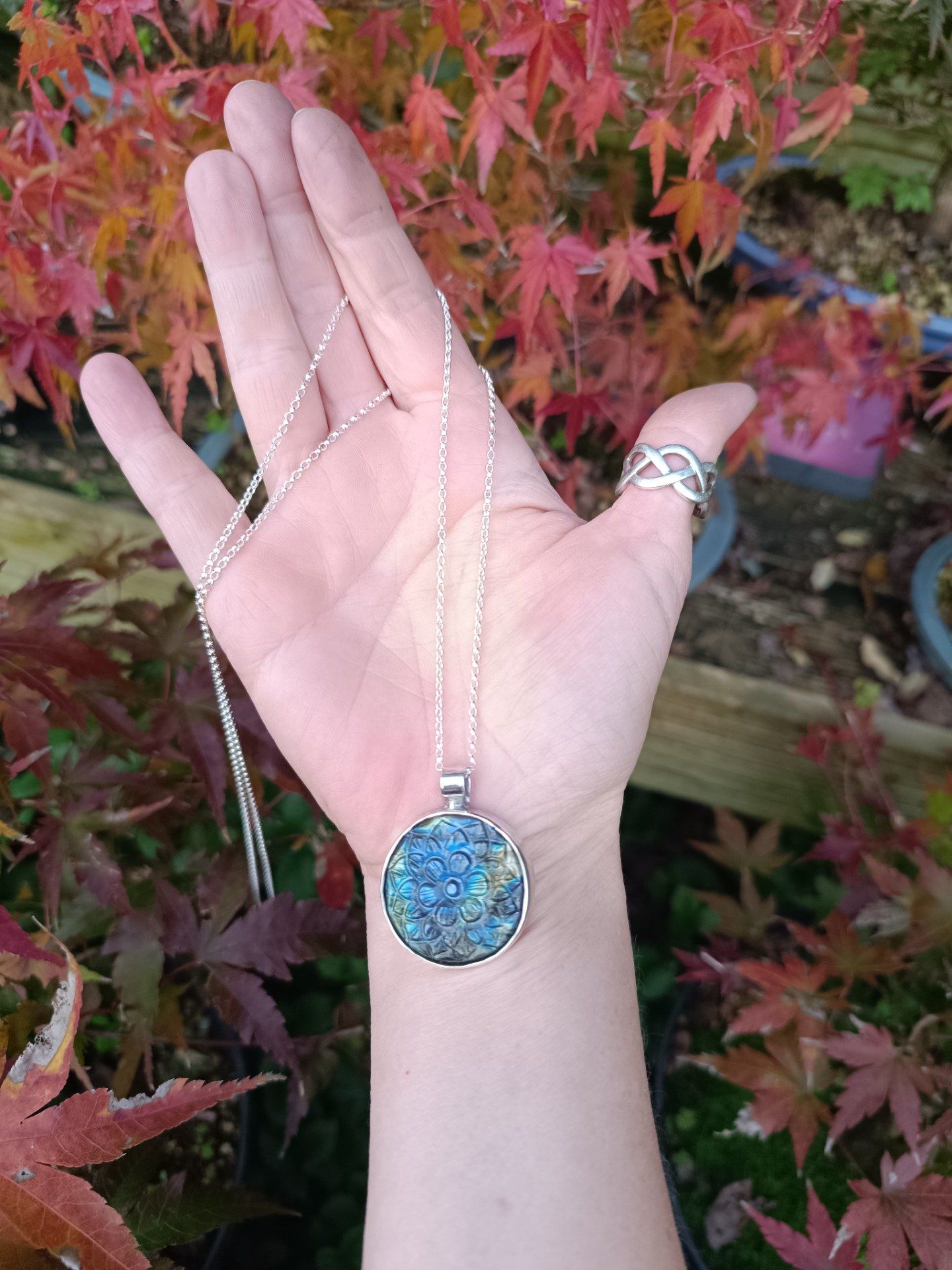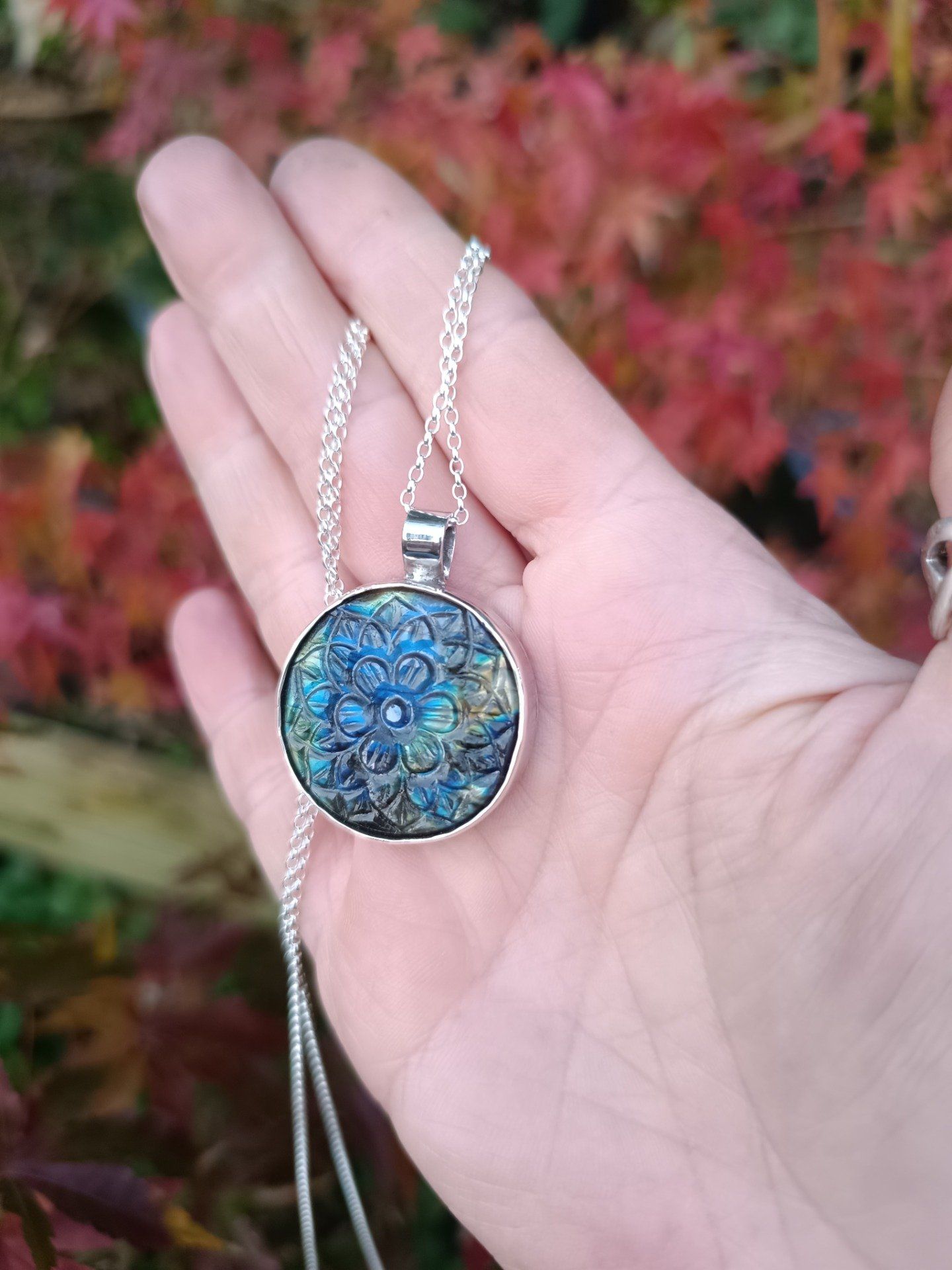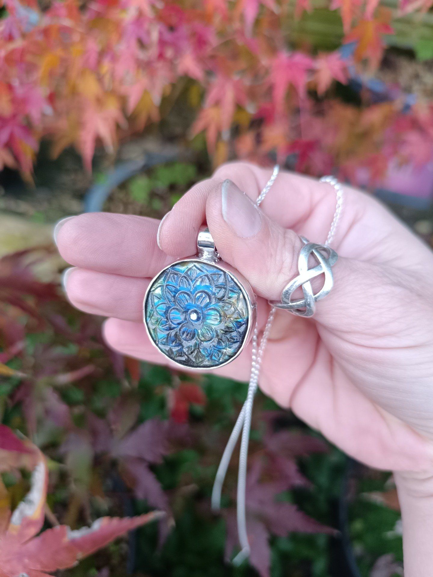 Pendentif en labradorite bleue gravée d’une fleur Mughal. Serti simple, dos ajouré pour laisser filtrer la lumière. Reflets irisés et tube discret en guise de bélière. Une fleur de lumière à porter comme un talisman.