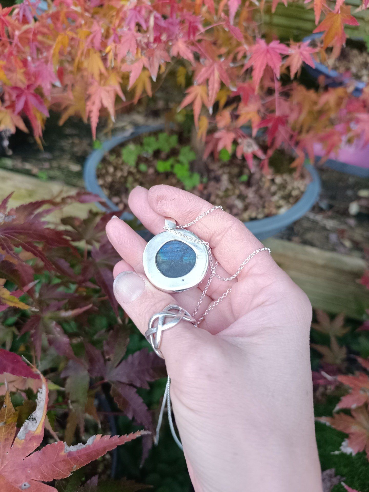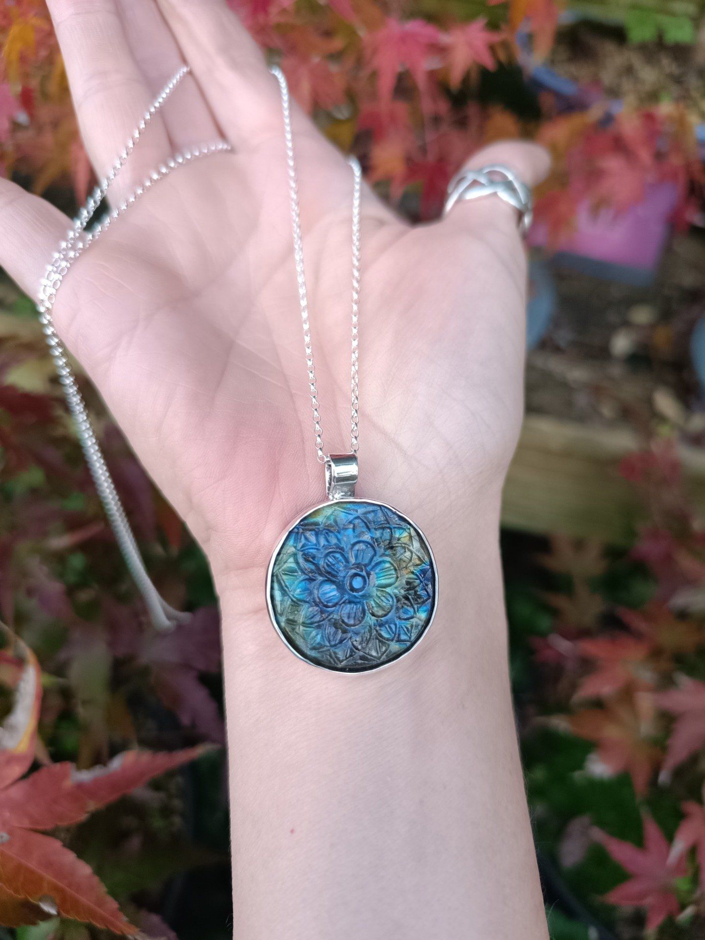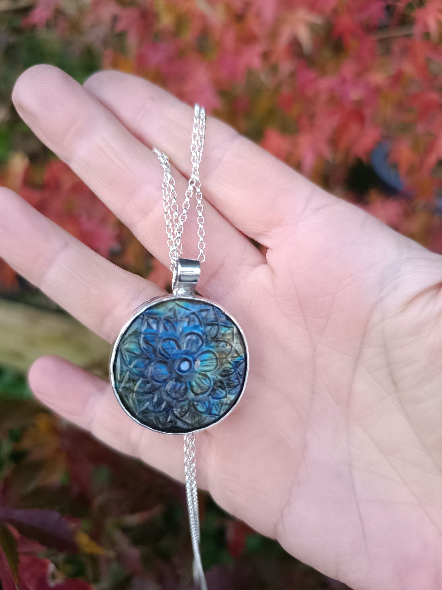 Pendentif en labradorite bleue gravée d’une fleur Mughal. Serti simple, dos ajouré pour laisser filtrer la lumière. Reflets irisés et tube discret en guise de bélière. Une fleur de lumière à porter comme un talisman.
