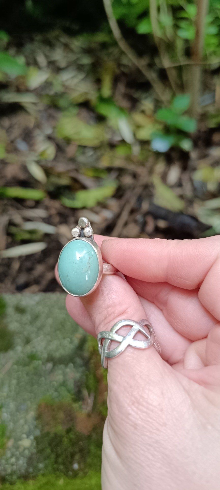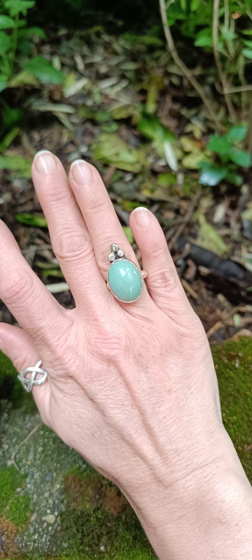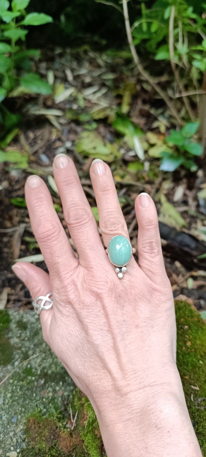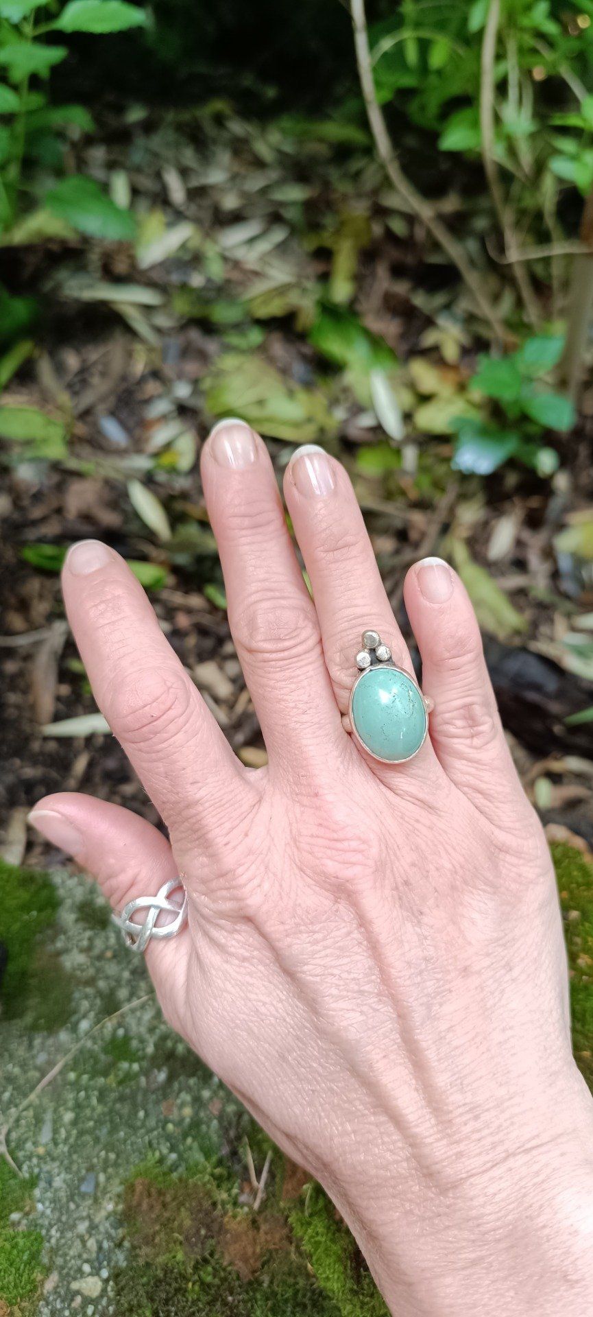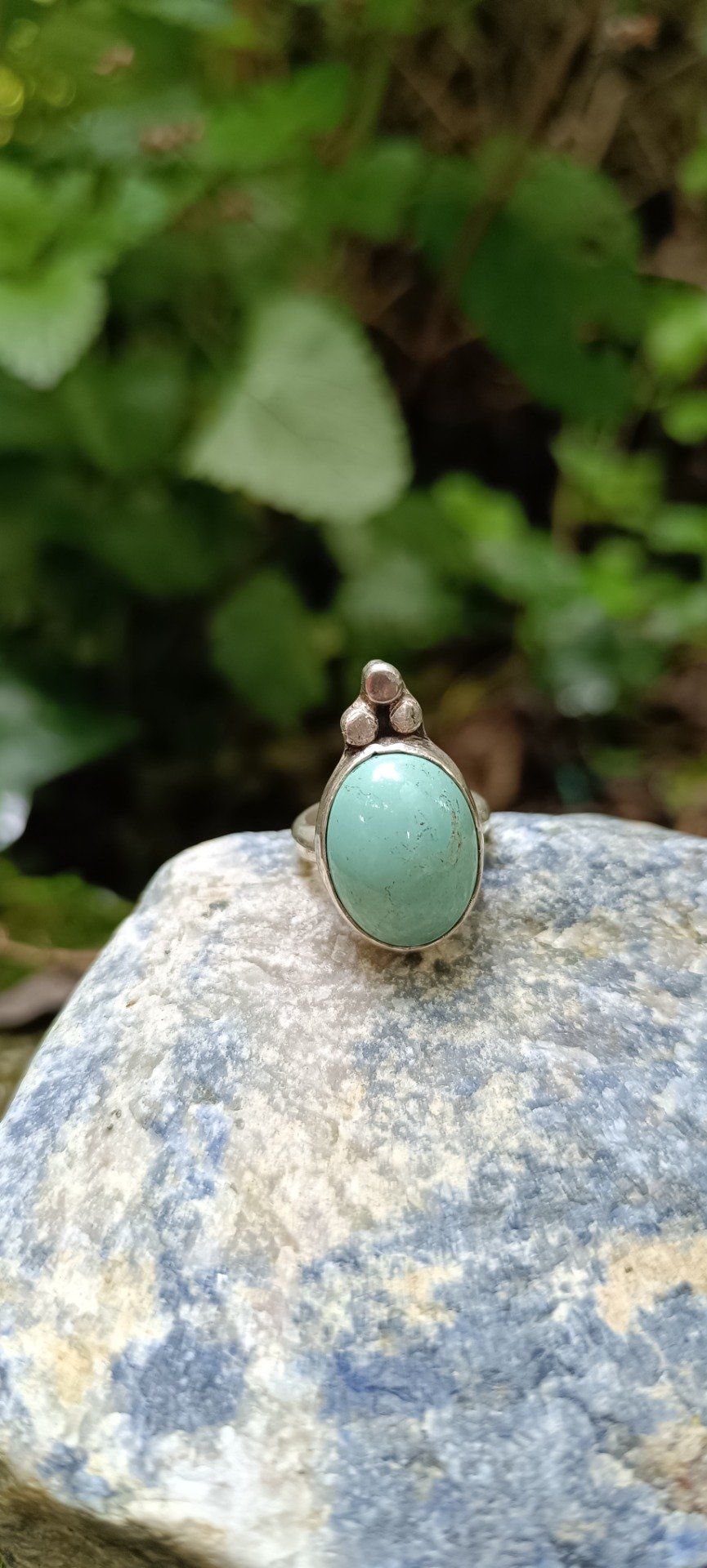 Bague talisman en turquoise d’Iran, pierre de protection et de paix. Trois billes d’argent forment une triade symbolique. Gardienne d’Ispahan est un bijou doux et puissant, façonné à la main pour cheminer en conscience.