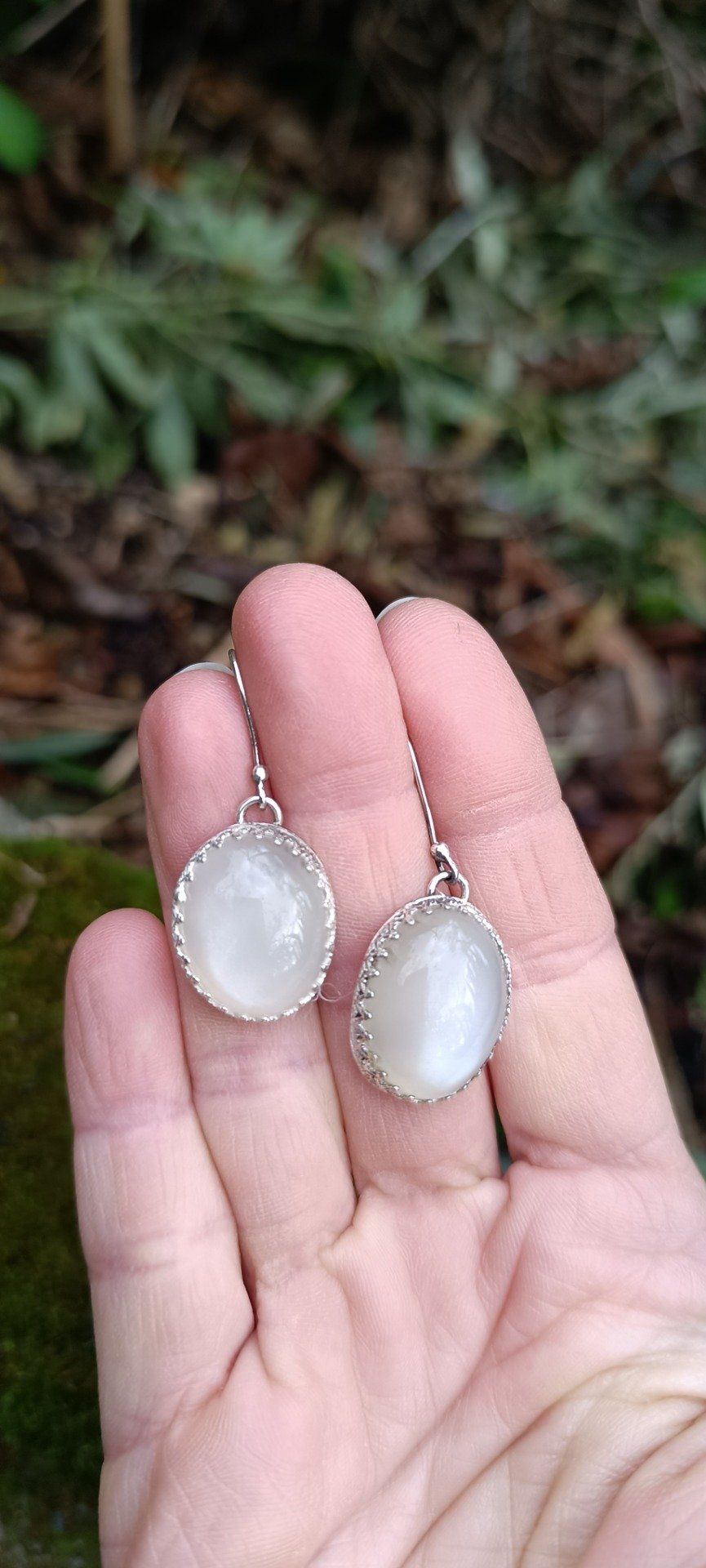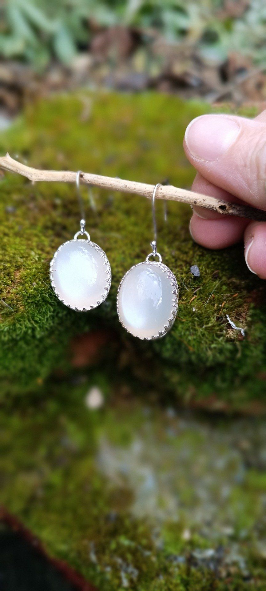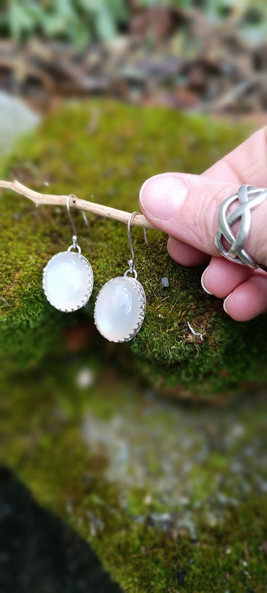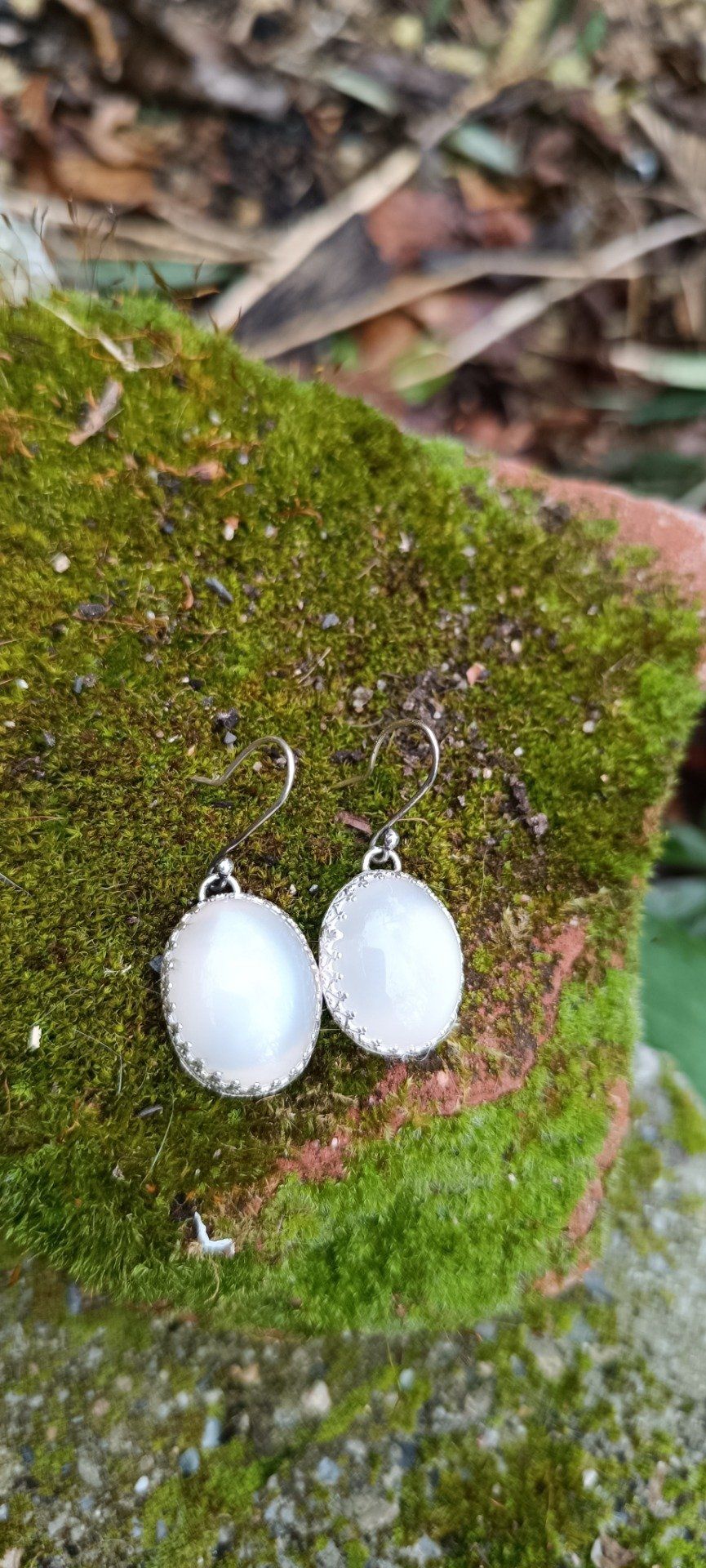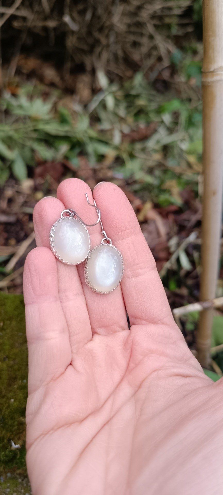 Les Lunaires sont une invitation à écouter les murmures du ciel. Deux pierres de lune ovales, montées sur dormeuses, capturent la lumière avec douceur, comme des fragments de clair de lune suspendus aux oreilles.