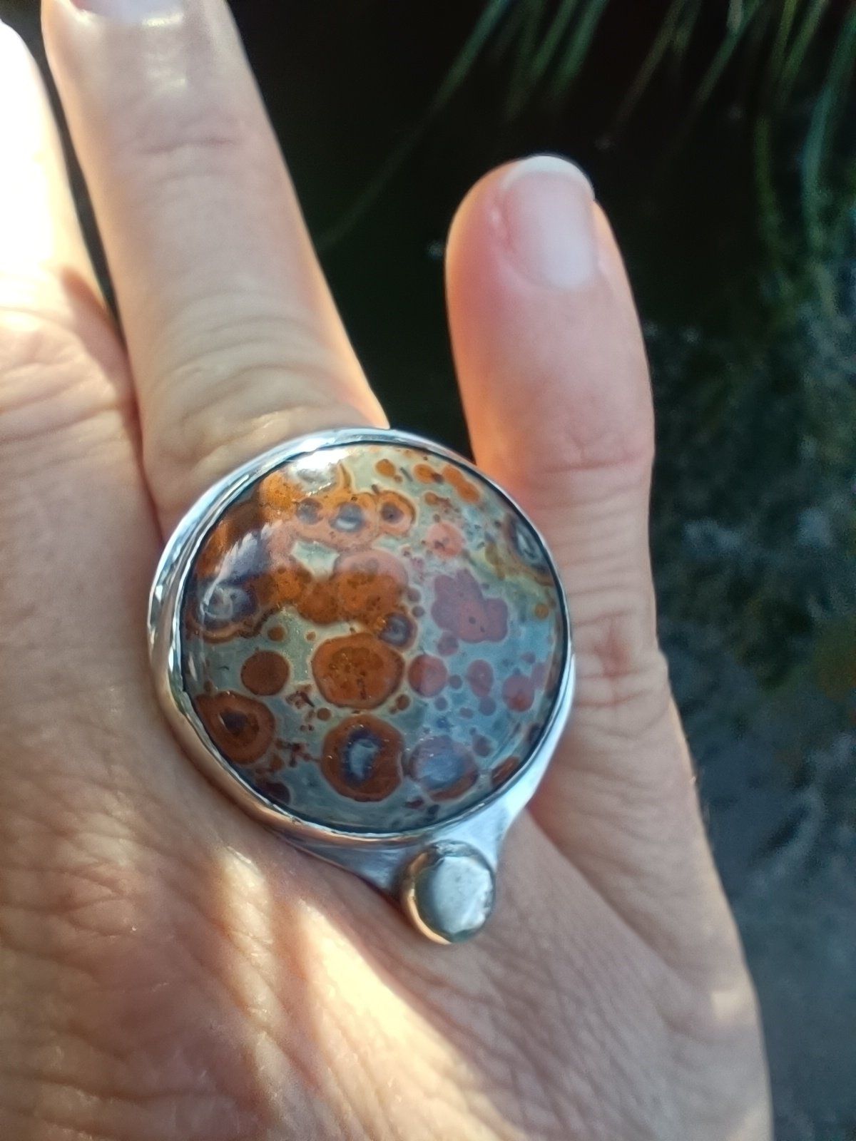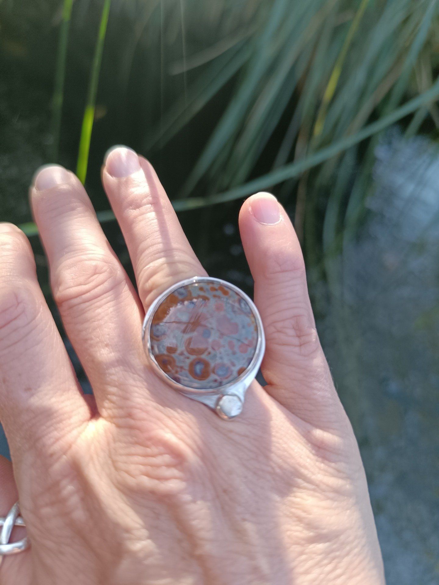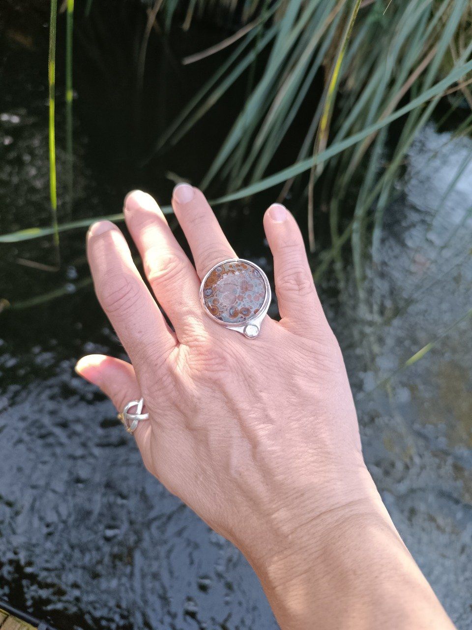 Son large cabochon — brun, gris, rouge — semble embraser la main, comme une fleur sauvage née d’un feu ancien.