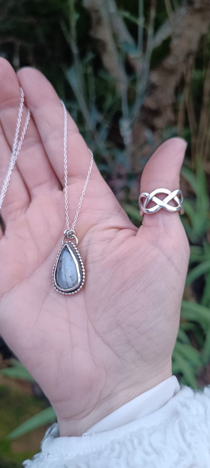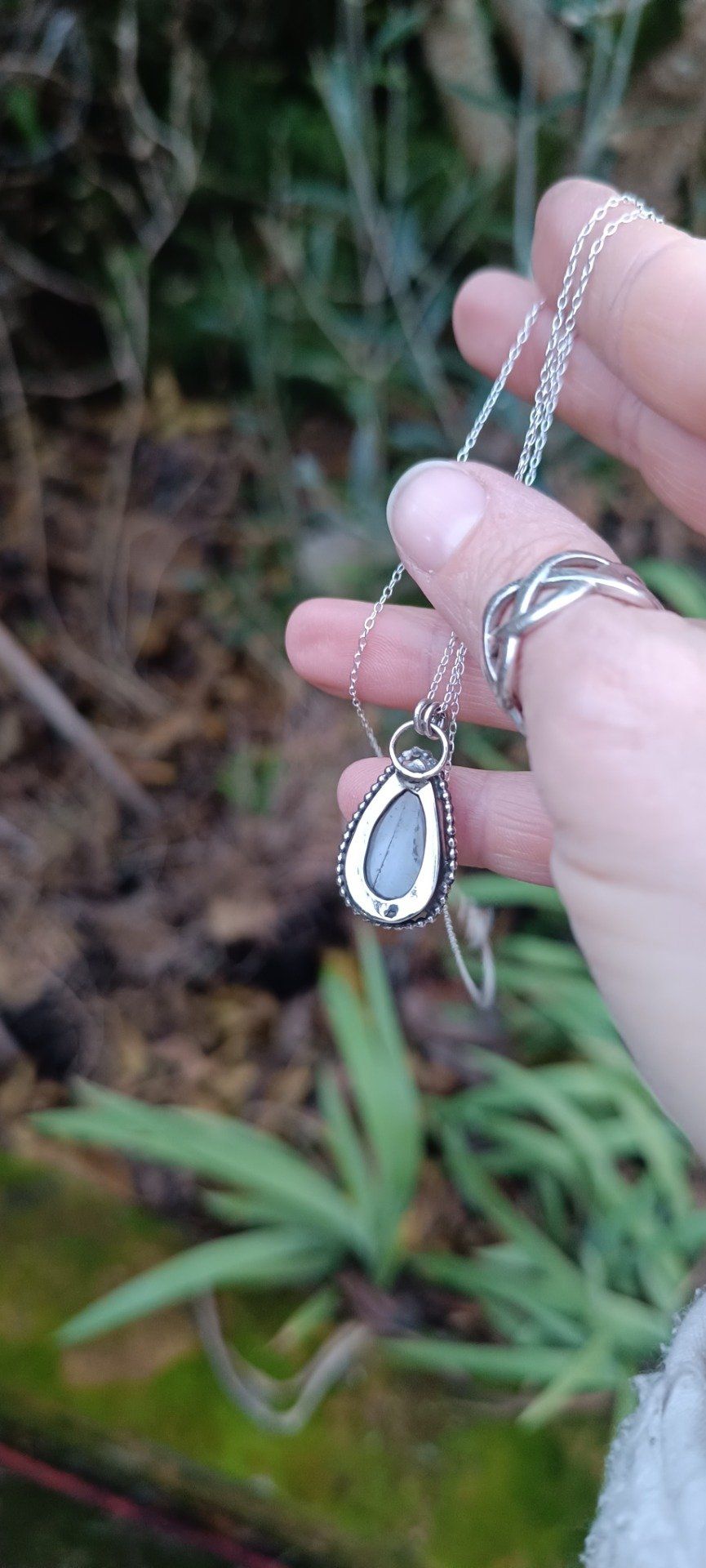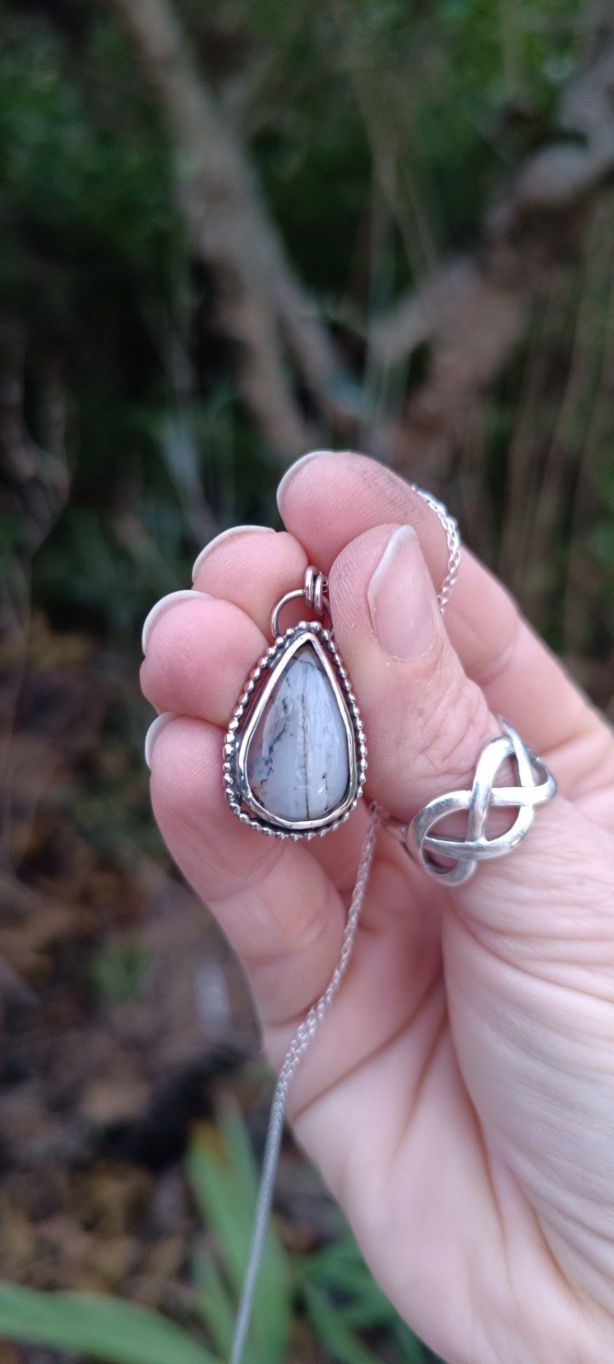 Agate du Montana en goutte, fil perlé en argent, dos ajouré. Racine Claire est un pendentif délicat et tellurique, traversé par une ligne centrale comme une colonne de vie. À porter pour s’ancrer avec douceur.