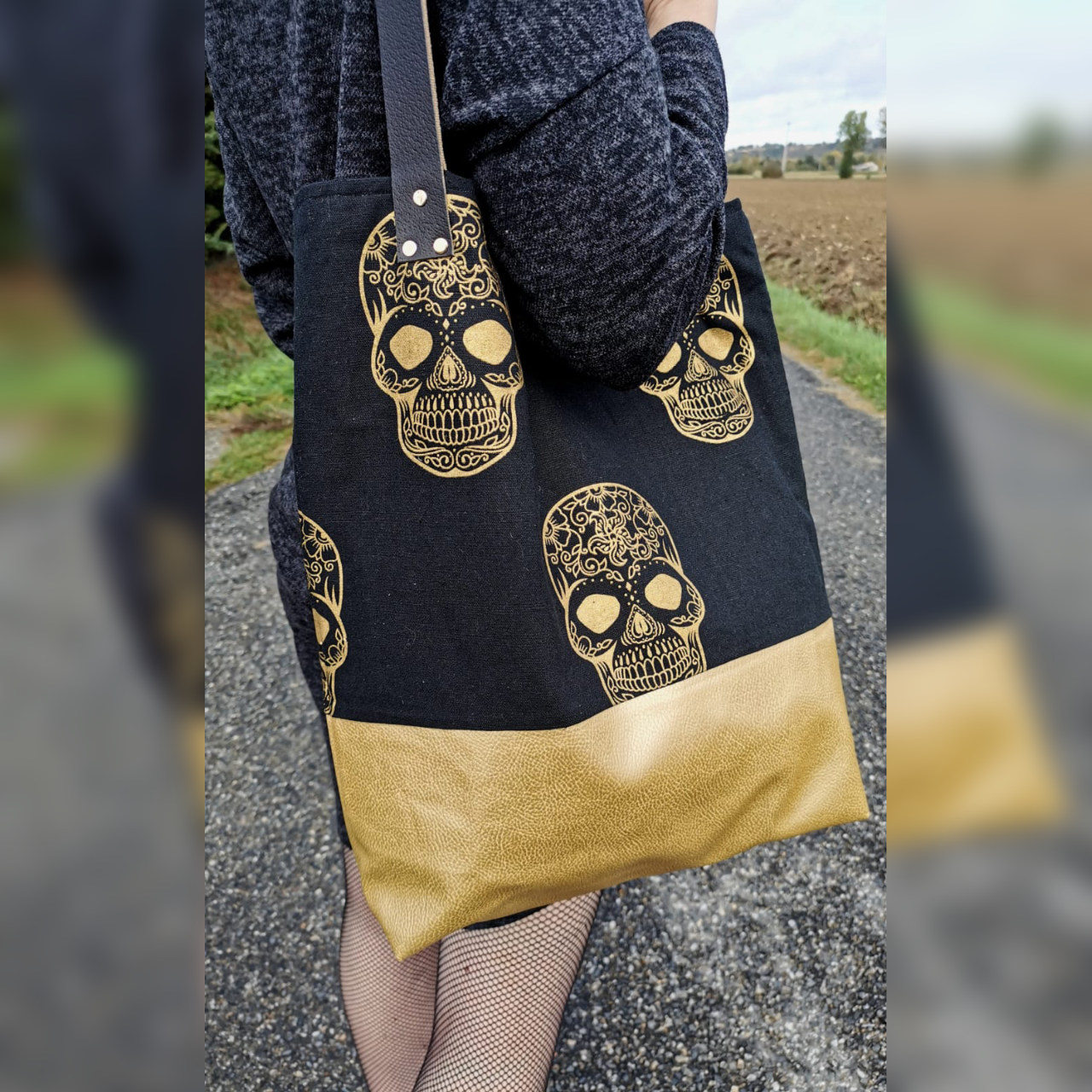 Imprimé skull or, doublure tissu lin mélangé, poche intérieure, fermeture magnétique et anses en cuir véritable.