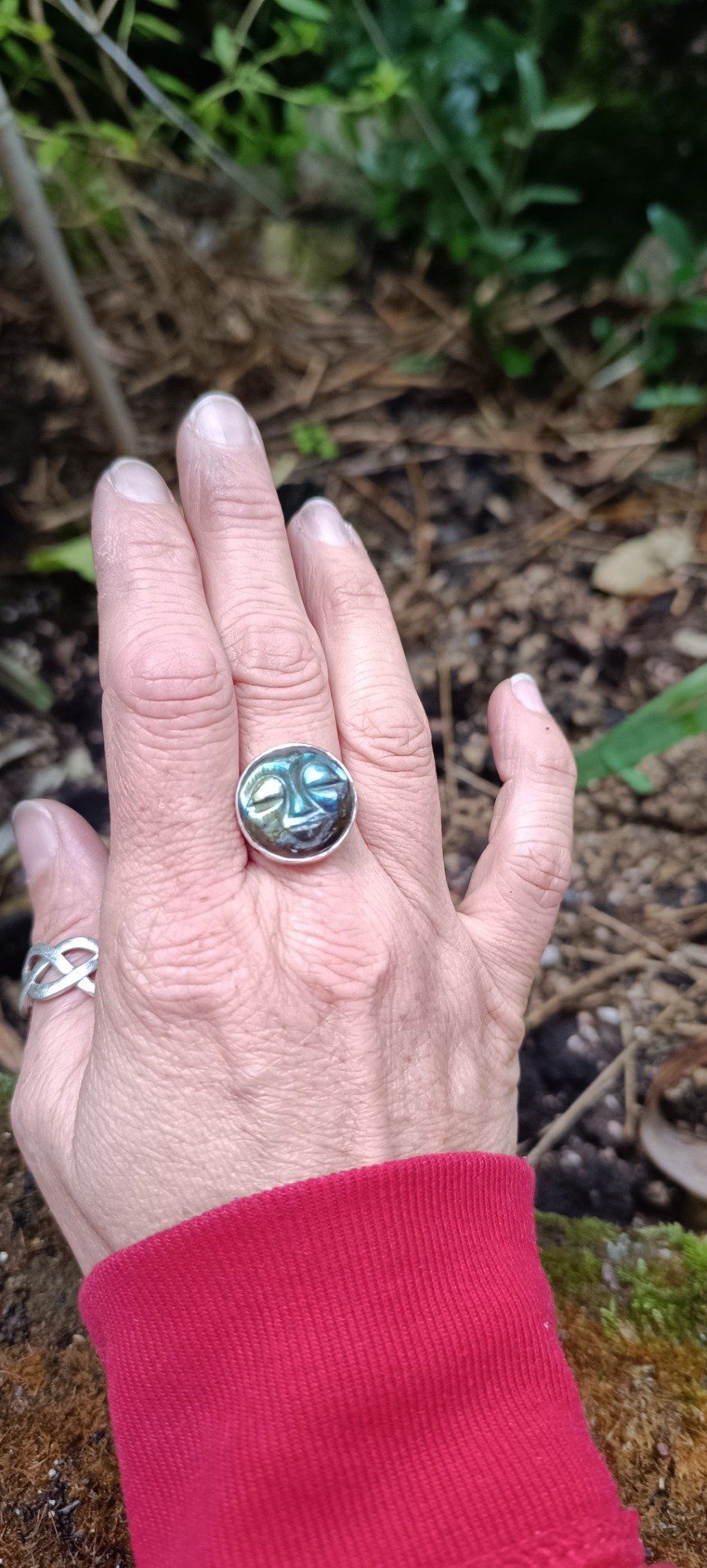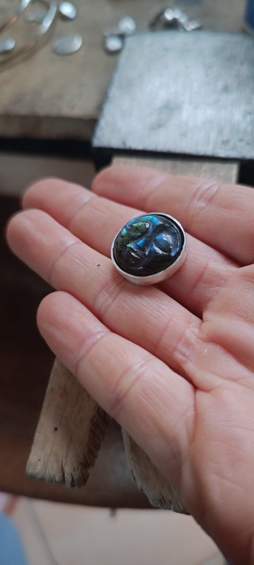Labradorite gravée d’un visage, sertie sobrement. Sous la pierre, une lune évidée, invisible une fois portée. Visage de Lune est un bijou secret, gardien d’intuition et de présence. Taille 60